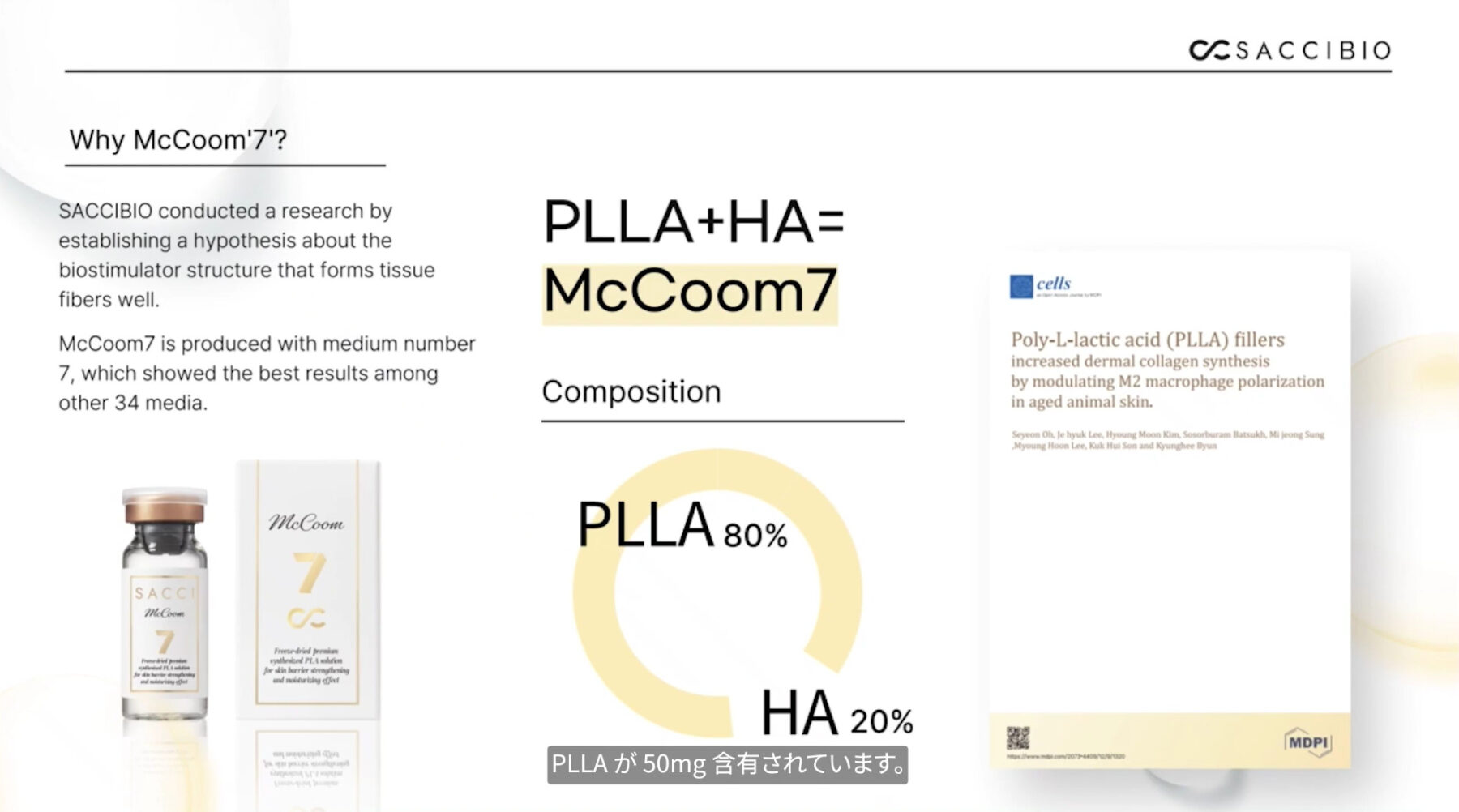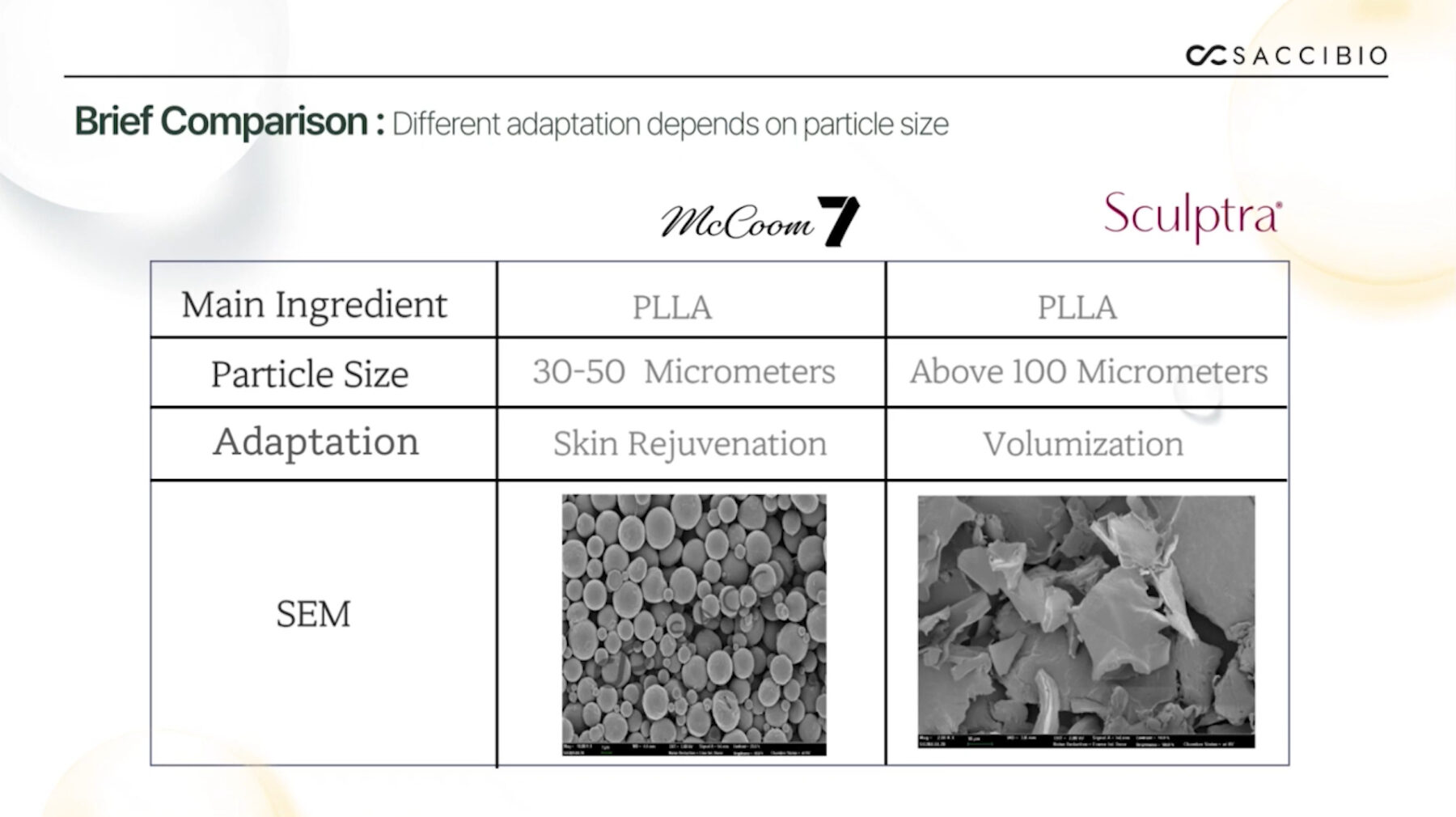 PLLA (poly-L-lactic acid) is a safe ingredient used in medical applications for many years, acting as a biostimulator that promotes collagen regeneration. Unlike conventional Sculptra, SACCIBio’s McCoom7 employs spherical microparticles. These particles maintain a consistent size and shape while degrading within the body, enabling uniform collagen production. Research reports indicate that McCoom7 increases TGF-β via the interleukin-4/13 pathway to promote collagen synthesis, while simultaneously suppressing collagen degradation through interleukin-10. This immune-modulating function is considered beneficial for a wide range of indications, including redness, rosacea, enlarged pores, scars, and fine lines.