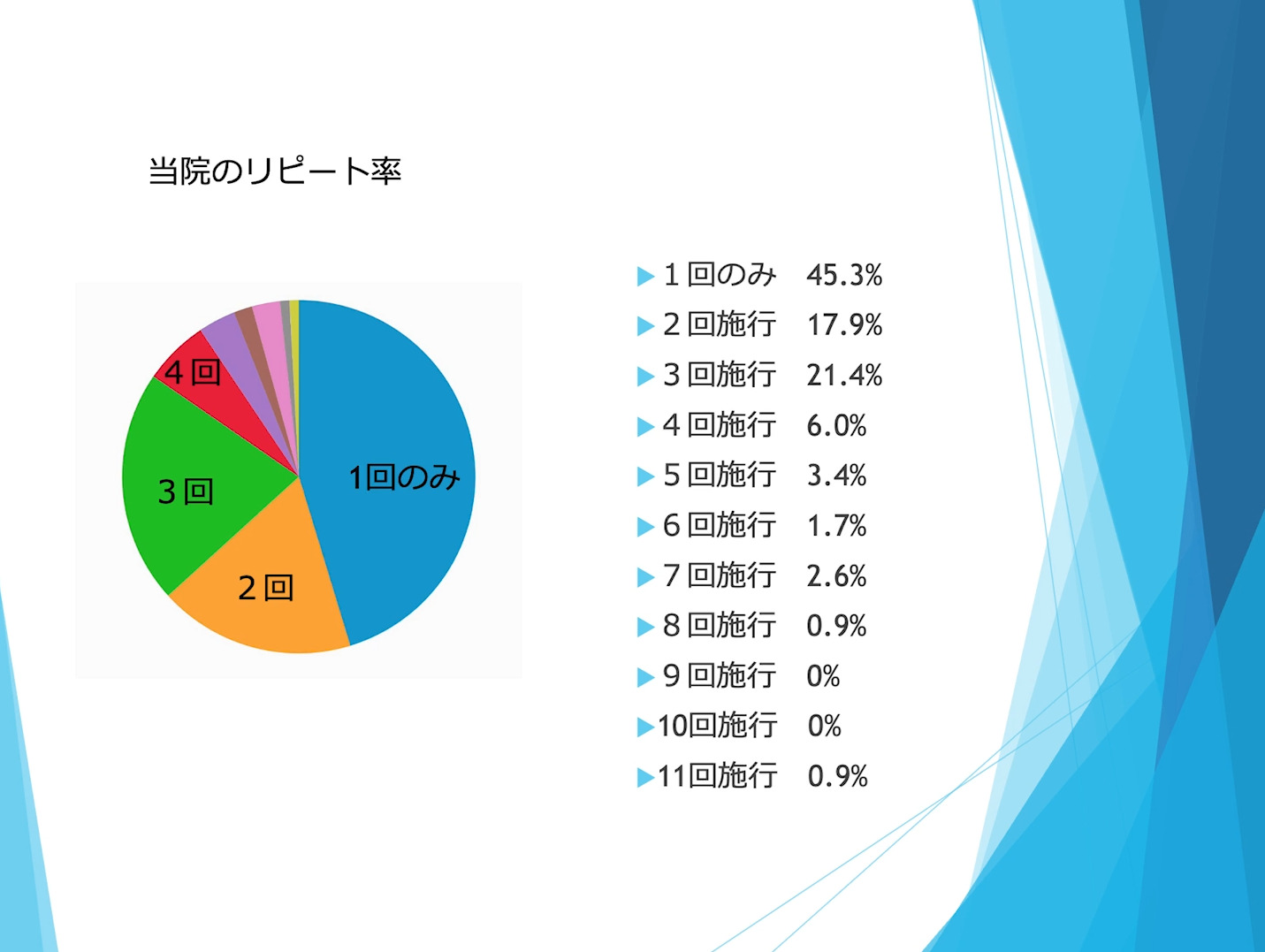 To maximize treatment effectiveness, optimizing the shot number is essential. Our clinic typically administers 2000 shots, to reduce pain, we deliver approx. 1700 shots during the first session and 300 during the second session. The current repeat visit rate is about 54.7%, but since we recommend a three-session course, this rate is expected to increase further.