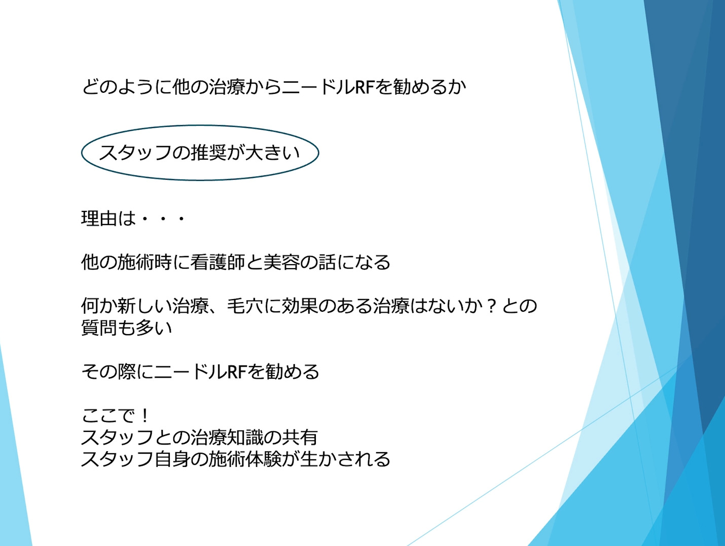There are two key factors for repeat business. First is “pain reduction.” Proper management of anesthesia and careful pressure application are crucial to minimize patient discomfort. Second is “perceived effectiveness.” Advance explanations about when and how treatment results appear help minimize the gap between expectations and outcomes, enhance satisfaction.