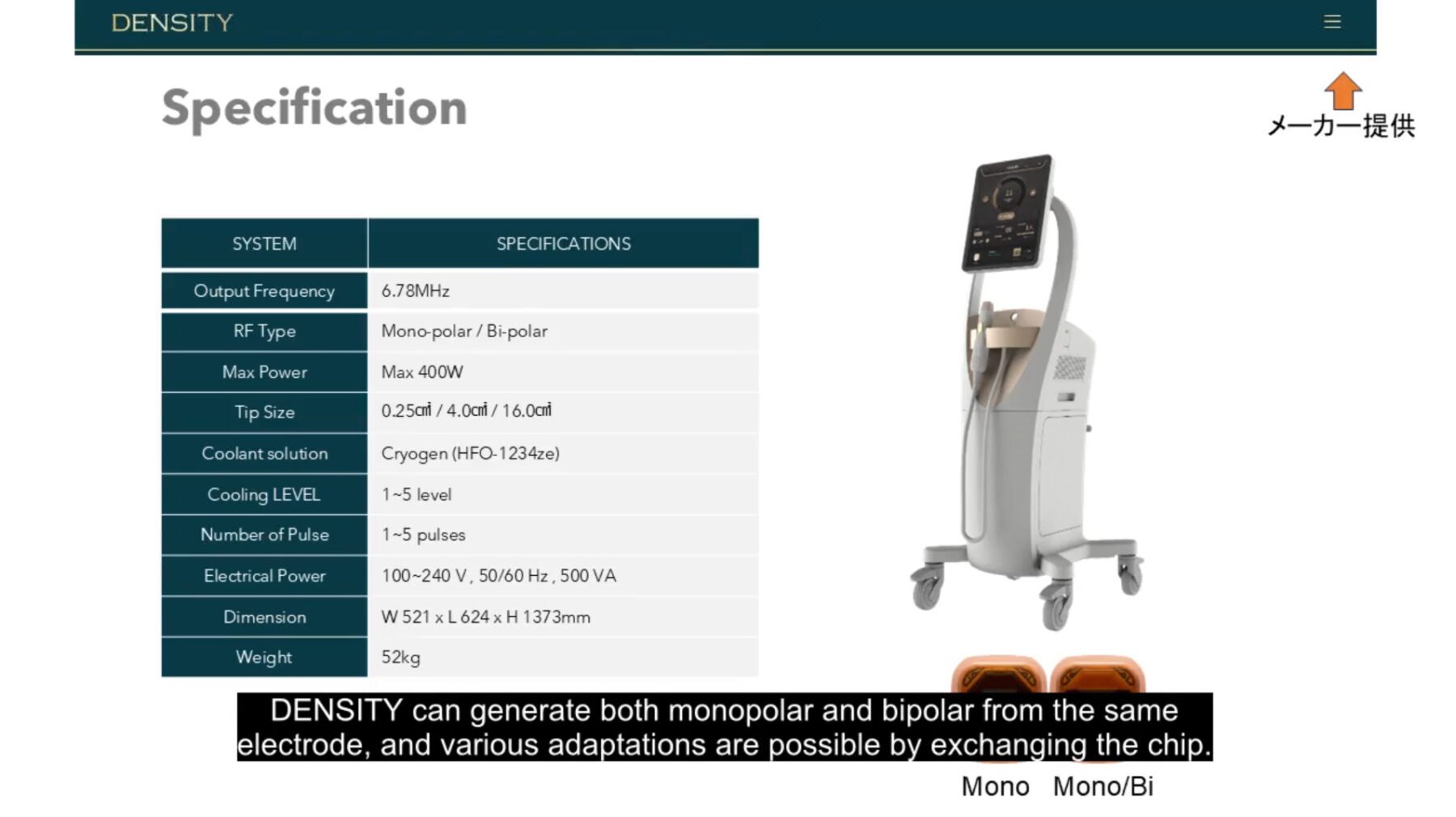 DENSITY features an innovative design among capacitively coupled RF systems, characterized by its ability to output both monopolar and bipolar modes from a single tip. The monopolar mode delivers heat to the deep layer, while the bipolar mode targets the dermis. Switching the final pulse of a 5-pulse sequence to bipolar mode—a technique supported by research on POTENZA—enhances heat penetration due to reduced impedance after monopolar irradiation. This approach achieves both deep, long-term remodeling and immediate superficial contraction, leading to increased patient satisfaction and repeat treatment rates.