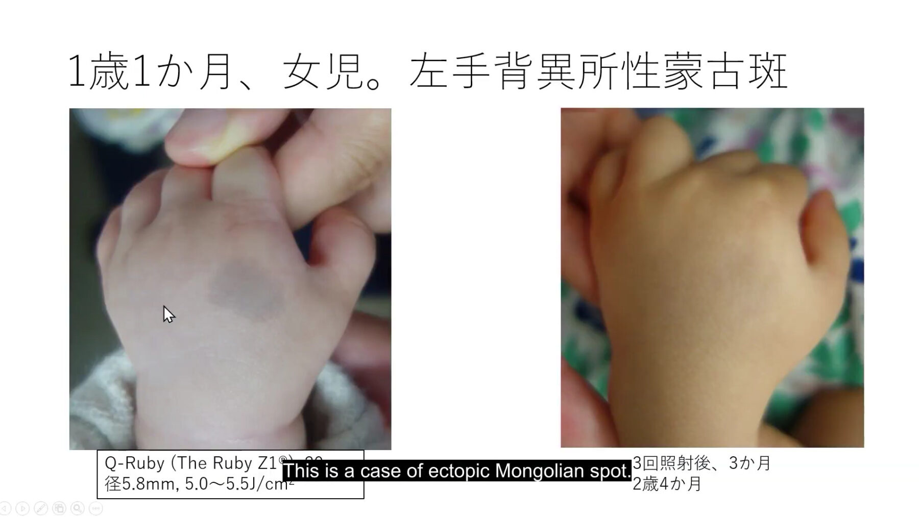 Q-switched laser treatment for pediatric birthmarks is often covered by insurance and can be applied to Nevus of Ota, Mongolian spots, and traumatic tattoos. Ruby laser treatment is covered for up to 5 sessions, and flat birthmarks are covered for up to 2 sessions. Self-pay treatments at our hospital primarily include solar lentigines, freckles, and ADM. For solar lentigines, IWP, scabs, or PIH may occur after laser treatment, but these improve with appropriate laser application and follow-up observation. Even when ADM does not improve with IPL, ruby laser treatment can be effective in some cases; selecting the appropriate wavelength based on lesion depth is crucial.